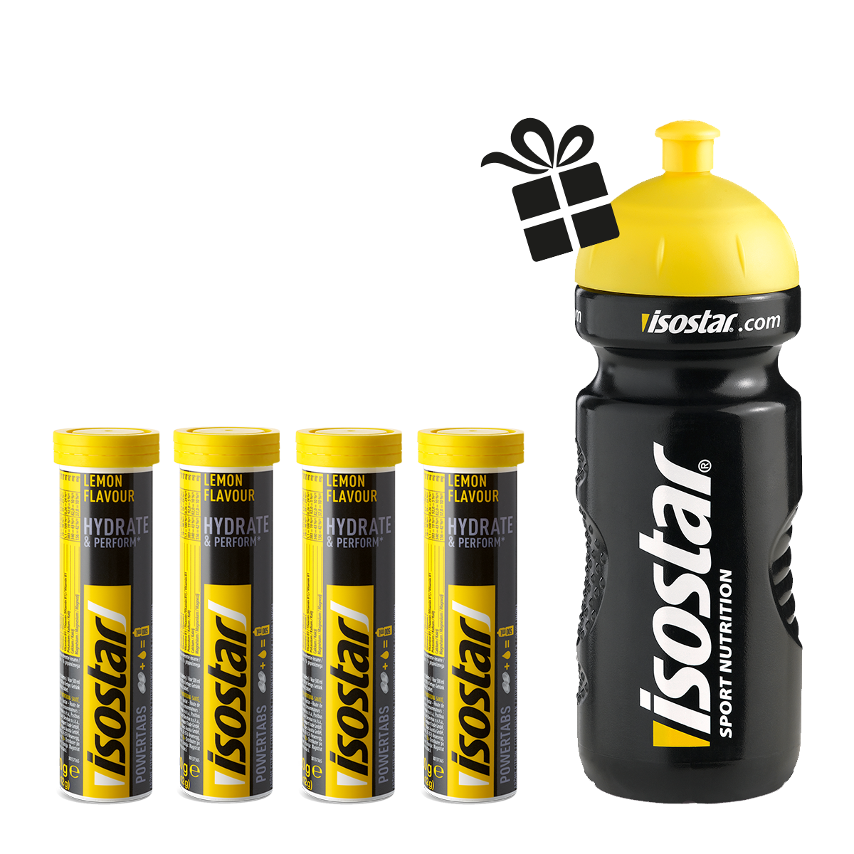 Das Isostar Powertabs Set Lemon besteht aus einem 4er Pack Brausetabletten zur Zubereitung eines energiereduzierten, kohlenhydrat- und elektrolythaltigen Sportgetränks und einem gratis 650ml Bidon. Die Zutatenliste, Nährwertangaben und Allergene findest du unter den jeweiligen Produkten.