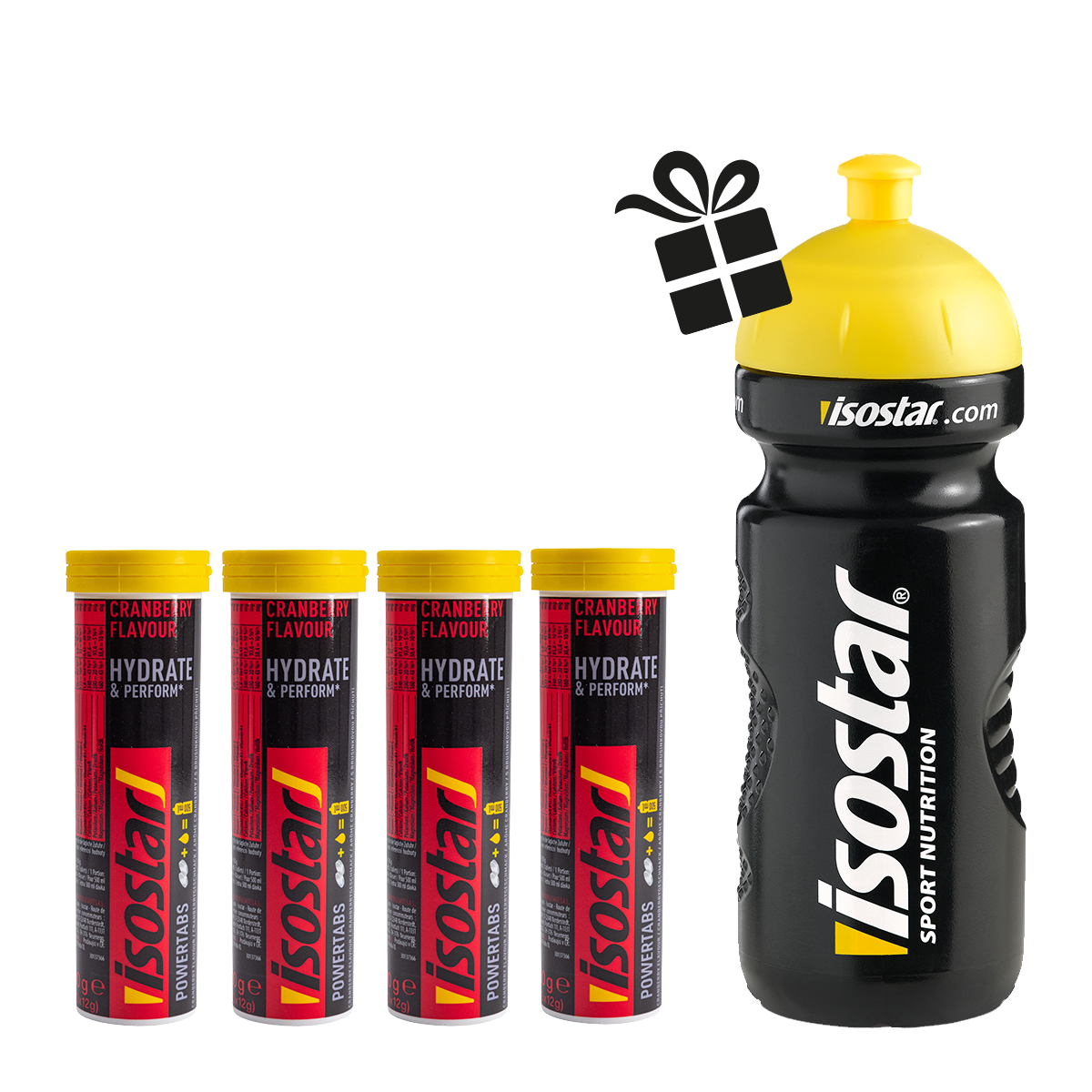 Das Isostar Powertabs Set Cranberry besteht aus einem 4er Pack Brausetabletten zur Zubereitung eines energiereduzierten, kohlenhydrat- und elektrolythaltigen Sportgetränks und einem gratis 650ml Bidon. Die Zutatenliste, Nährwertangaben und Allergene findest du unter den jeweiligen Produkten.