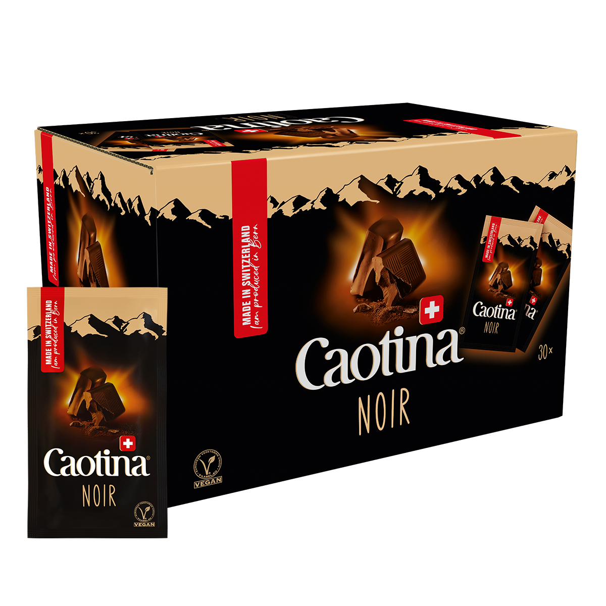 Caotina Noir verzaubert Ihre Sinne durch die einzigartige Mischung aus dunkler Schweizer Schokolade und einem hohen Kakaoanteil von 45%. Die portionierten Caotina Noir Sachets eignen sich bestens für spontane Genussmomente.