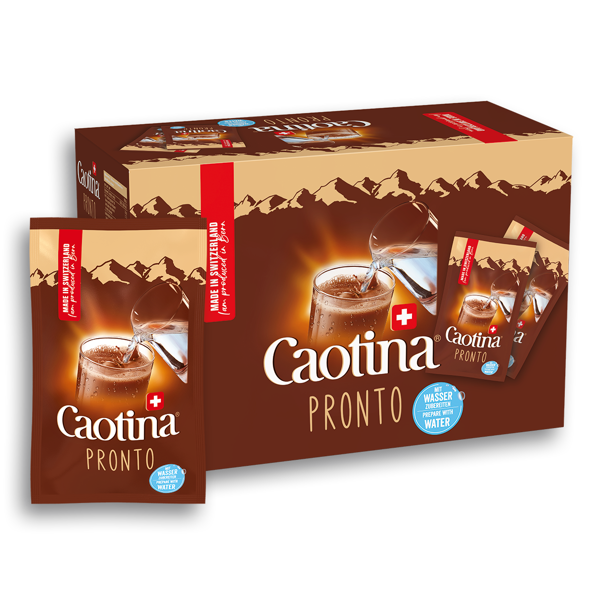 Caotina Pronto lässt sich in kaltem oder warmen Wasser ganz einfach auflösen. In praktischen Portionenbeuteln – purer Genuss aus feinster Schweizer Schokolade und Milchpulver. Schmeckt genau so gut wie Caotina - das Schweizer Original. Ein Genussmoment für kalte Wintertage oder zur Erfrischung nach einem heissen Sommertag.