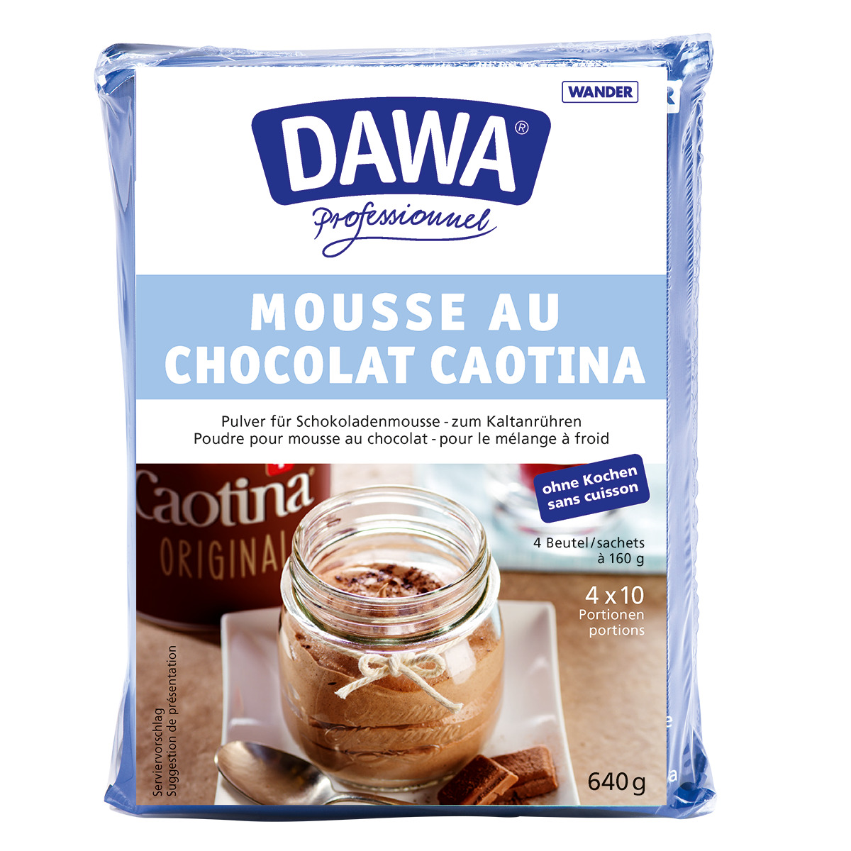 Die schokoladige Mousse au Chocolat Caotina von Dawa gibt es neu auch in der Kleinpackung mit 4 Beuteln. Blitzschnell bereiten Sie pro Beutel mit 250 ml Vollmilch und 250 ml Vollrahm 10 Portionen von dem schokoladigen Dessertraum zu. Ihre Gäste werden es lieben.