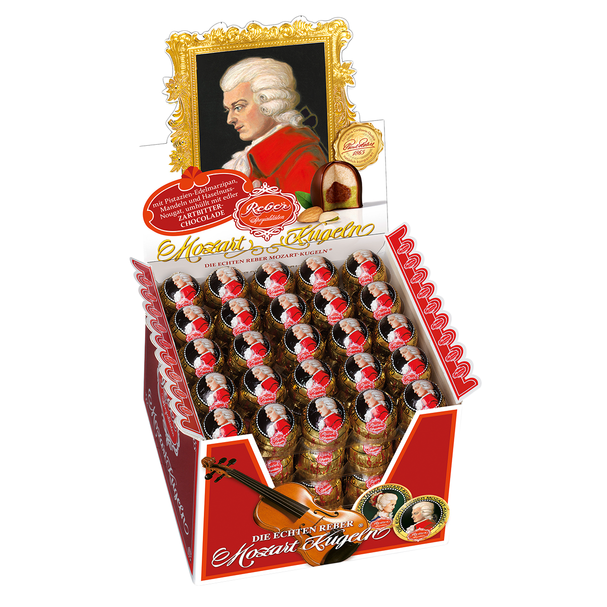 Pralines au chocolat noir (17%) et chocolat au lait des Alpes (18%) avec un nougat aux noisettes (10%) en pâte d'amande pistache (30%) et en massepain (25%) -