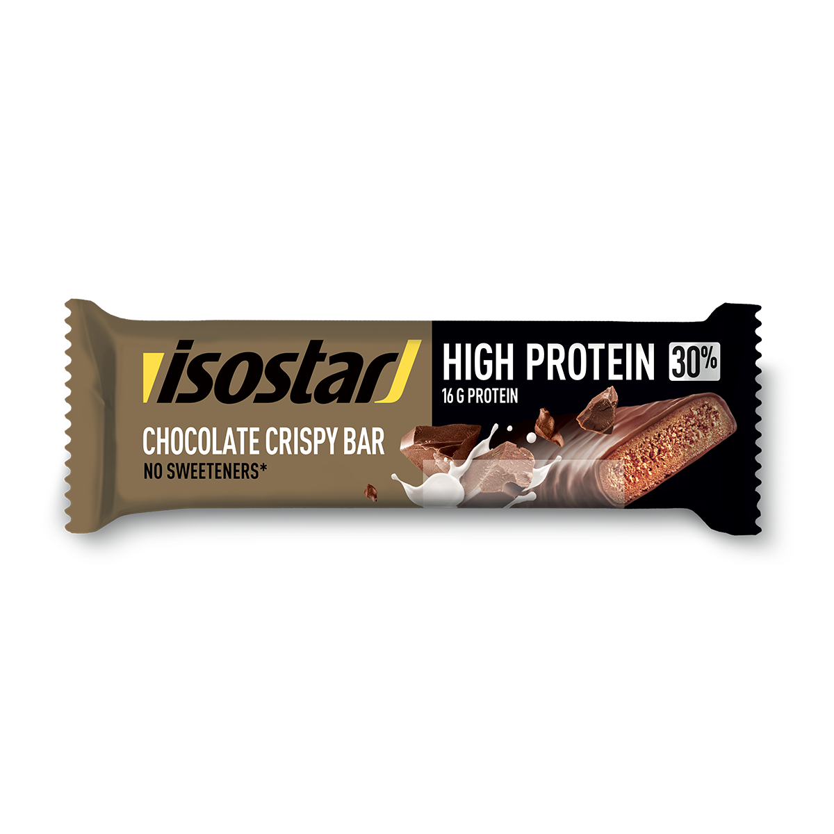 Isostar High Protein barre Chocolate Crispy: à consommer avant ou après l’entraînement, comme snack ou comme en-cas nourrissant. Les délicieuses High Protein barres sont aussi disponibles saveur Toffee Crunchy.