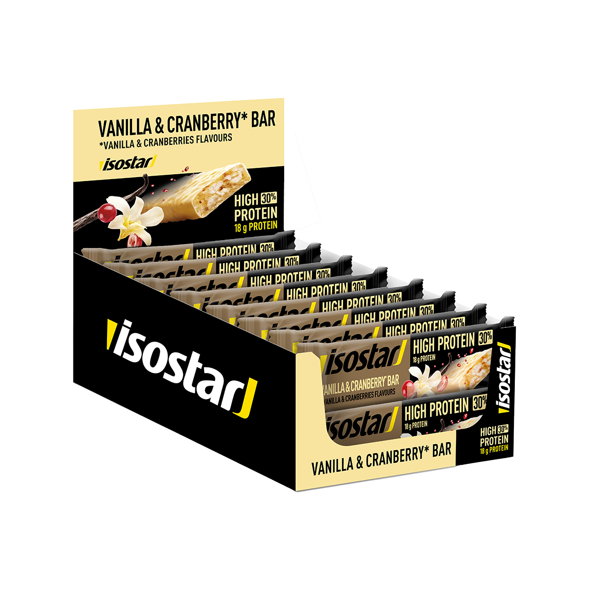 Isostar High Protein barre Vanilla&Cranberry: à consommer avant ou après l’entraînement comme en-cas nourrissant ou comme snack. Les délicieuses High Protein barres sont aussi disponibles saveur Toffee Crunchy et Chocolate Crispy.