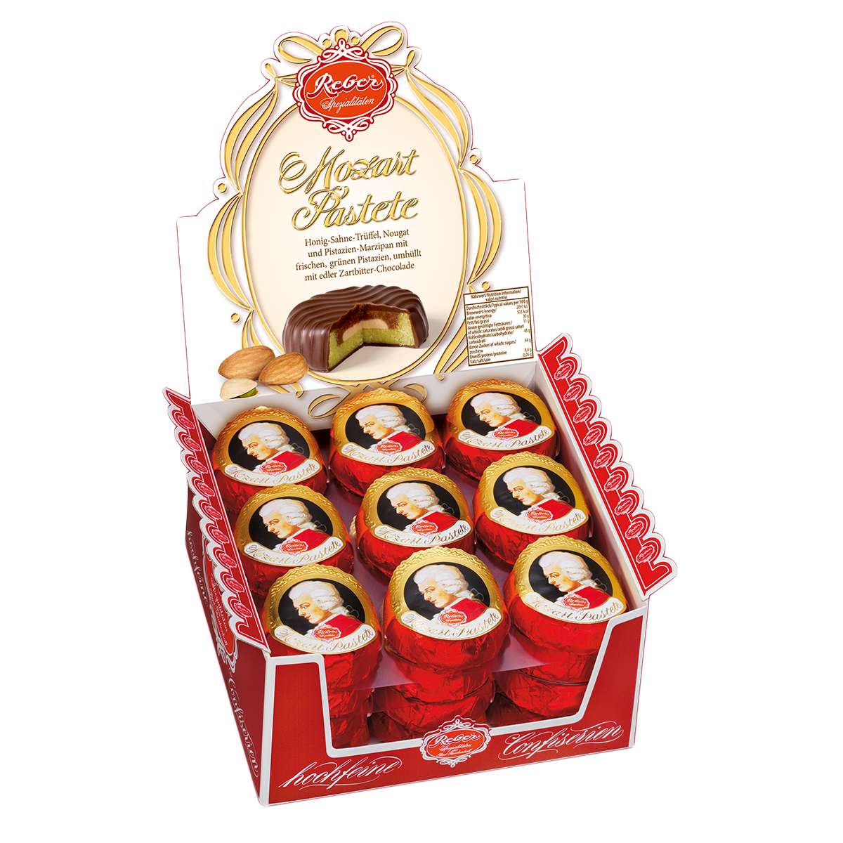 Truffes crémeuses au miel et à la pâte de pistache réalisée à partir de pistaches fraîches et vertes, enrobées de délicieux chocolat noir. Découvrez-en plus sur la marque Reber et ses produits tels que les célèbres boules Mozart.